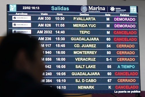 Una pantalla muestra vuelos cancelados a Guadalajara y Tepic en el Aeropuerto Internacional Benito Juárez luego de que las autoridades reforzaron la seguridad tras bloqueos de carreteras y ataques incendiarios perpetrados por el crimen organizado en varios estados, tras un operativo militar en el que, según una fuente gubernamental, el narcotraficante mexicano Nemesio Oseguera, conocido como "El Mencho", fue asesinado en el estado de Jalisco, en la Ciudad de México, México, el 22 de febrero de 2026. Reuters/Luis Cortés.