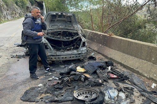 El periodista de Al Mayadeen, Jamal Al-Gharabi, se encuentra junto al automóvil destruido de dos periodistas libaneses que murieron en un ataque selectivo israelí, en medio de la escalada de hostilidades entre Israel y Hezbolá.